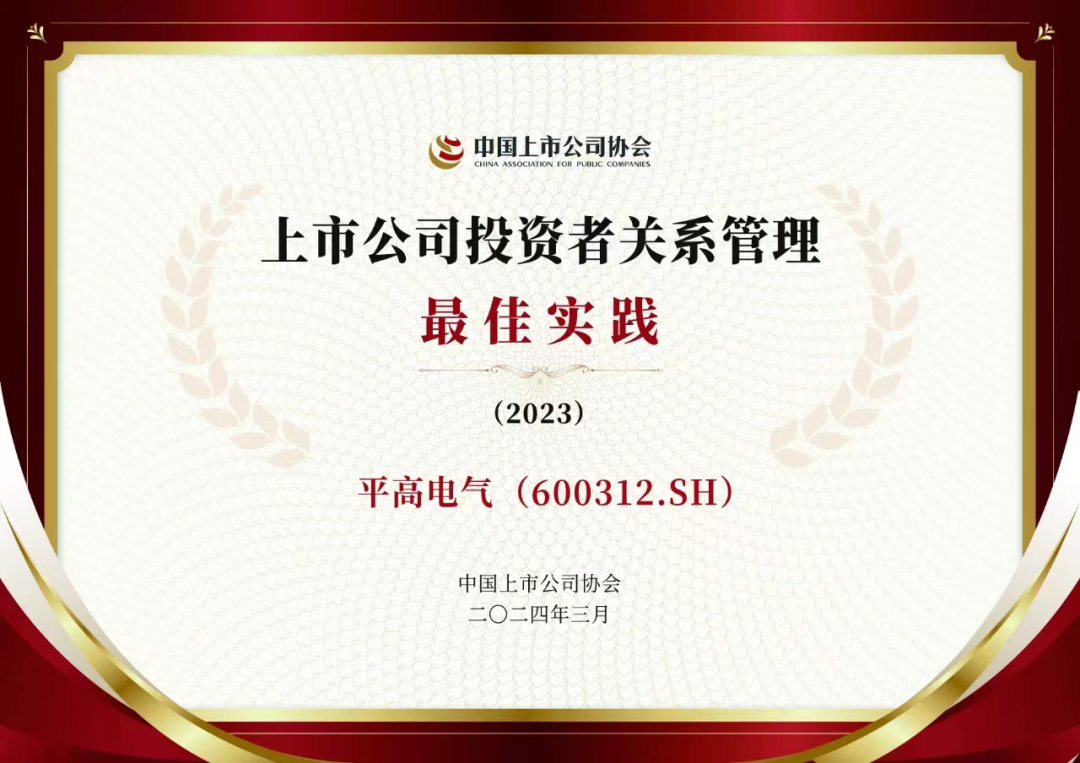 良好、高效的投資者關(guān)系管理有利于提高公司的社會形象,助力公司實現(xiàn)價值傳遞和價值發(fā)現(xiàn)。為助力上市公司提升投資者關(guān)系管理工作水平,中國上市公司協(xié)會于2023年度首次開展“上市公司投資者關(guān)系管理最佳實踐”活動。近日,該活動評選結(jié)果揭曉,平高電氣榮獲2023年度“投資者關(guān)系管理最佳實踐”榮譽。在滬深兩市5000余家上市公司中,僅有96家上市公司榮獲上述榮譽。
