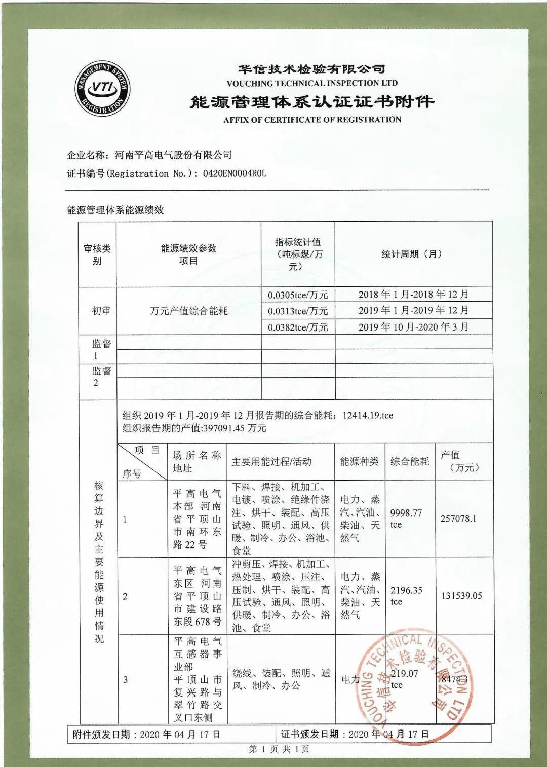 2020年,平高電氣取得了河南省國(guó)家綠色工廠認(rèn)證,并入選河南省節(jié)能減排科技創(chuàng)新示范企業(yè)。平高電氣致力于新型綠色環(huán)保電力設(shè)備研制,助力企業(yè)清潔低碳轉(zhuǎn)型。實(shí)施新型綠色環(huán)保電力設(shè)備研制及企業(yè)自身節(jié)能升級(jí)改造,推廣使用節(jié)能新技術(shù)、新工藝、新設(shè)備、新材料。引進(jìn)先進(jìn)智能型電氣火災(zāi)監(jiān)控系統(tǒng),著力提升火災(zāi)預(yù)防能力和應(yīng)急管理水平。結(jié)合新一代信息技術(shù)開(kāi)展能源在線監(jiān)測(cè)建設(shè),基本實(shí)現(xiàn)能源信息化、數(shù)字化管理,能源利用率顯著提高,節(jié)能增效成績(jī)顯著,2020年實(shí)現(xiàn)能源降本約950萬(wàn)元,綜合能耗同比下降約8.9%,實(shí)現(xiàn)產(chǎn)值節(jié)能量約995噸標(biāo)煤,并于2020年取得國(guó)家能源管理體系認(rèn)證證書(shū)。