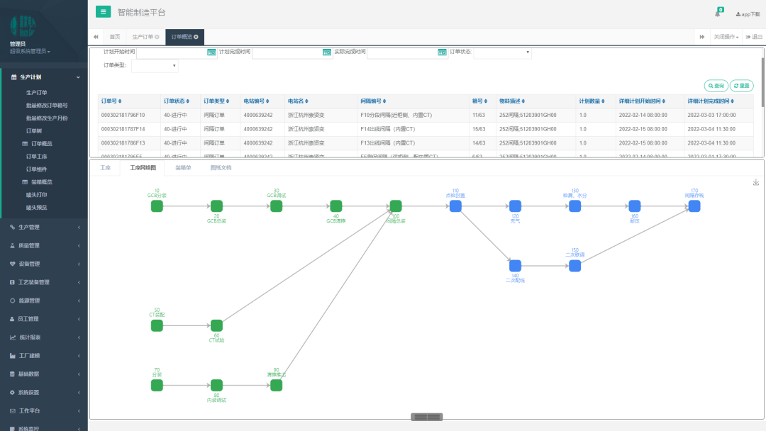 在車(chē)間生產(chǎn)環(huán)節(jié),無(wú)論是電力設(shè)備的裝配制造、試驗(yàn)檢驗(yàn),還是設(shè)備核心零部件的機(jī)械加工、環(huán)氧澆注、表面處理,全部通過(guò)MES系統(tǒng)的高級(jí)計(jì)劃排程功能,建立班組人員庫(kù)、場(chǎng)地資源庫(kù)、工裝設(shè)備庫(kù)、能源耗用標(biāo)準(zhǔn)庫(kù)等,通過(guò)主生產(chǎn)任務(wù)、物料需求計(jì)劃的需求進(jìn)行車(chē)間級(jí)、工序級(jí)任務(wù)分解,真正指導(dǎo)車(chē)間作業(yè)調(diào)度。同時(shí),借助工業(yè)網(wǎng)絡(luò)與數(shù)控機(jī)床、檢驗(yàn)設(shè)備自動(dòng)生產(chǎn)線等互通,達(dá)到生產(chǎn)執(zhí)行過(guò)程的管理控制與數(shù)據(jù)監(jiān)控。