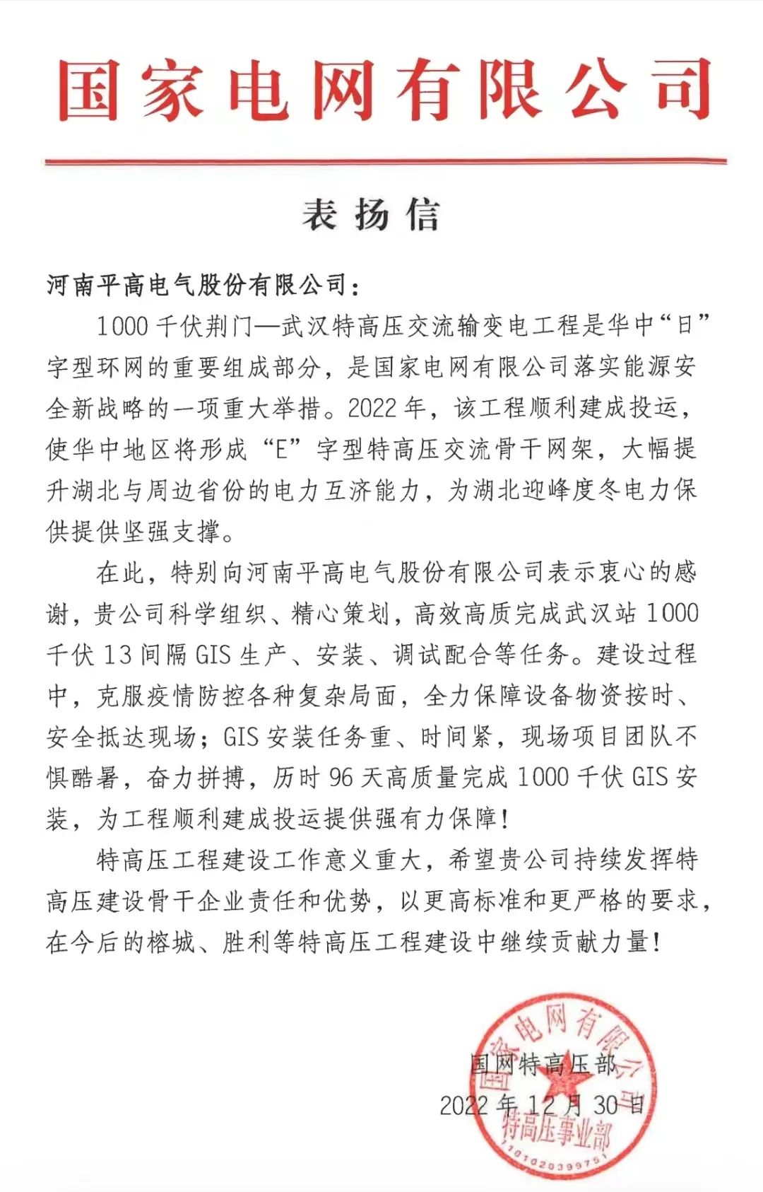 近日,平高電氣收到國網(wǎng)特高壓部表揚信,對高質高效完成武漢站1100千伏13間隔GIS生產(chǎn)、安裝、調(diào)試配合等任務表示衷心感謝。平高電氣克服疫情防控復雜局面,全力保障設備物資按時、安全抵達現(xiàn)場,歷時96天高質量完成現(xiàn)場安裝,為工程順利建成投運提供強有力保障,成為2022年唯一獲得表揚信的國網(wǎng)公司主設備廠家。