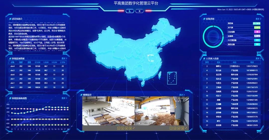 現(xiàn)場采用平高自主設計開發(fā)的現(xiàn)場數(shù)字化管控云平臺,首次在特高壓設備安裝過程中實現(xiàn)數(shù)字化管理,實現(xiàn)了安裝計劃管理、人員資質管理、移動廠房內(nèi)環(huán)境監(jiān)測、關鍵作業(yè)數(shù)據(jù)實時上傳、數(shù)據(jù)自動匯總分析關鍵工序視頻記錄等9大功能。